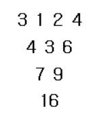 예를 들어 N이 4 이고 가장 윗 줄에 3 1 2 4 가 있다고 했을 때, 다음과 같은 삼각형이 그려진다.