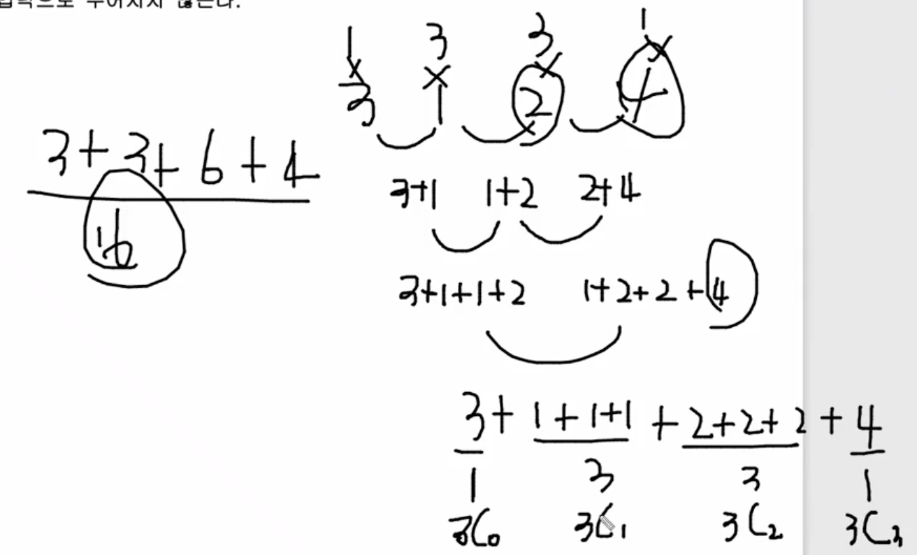 위 예시에서는 3x1 + 1x3 + 2x3 + 4x1 = 16으로 정답