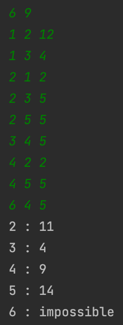 첫째 줄에는 정점의 수 N(1<=N<=20)와 간선의 수 M가 주어진다. 그 다음부터 M줄에 걸쳐 연결정보와 거리비용이 주어진다.