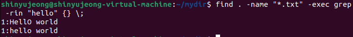 find . -type f -name "*.txt" : 현재 폴더에서 파일타입 중 .txt로 끝나는 파일명 검색