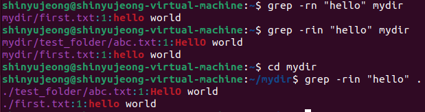 hello문자열을 라인수와 함께 mydir폴더에서 대소문자 구분없이 검색