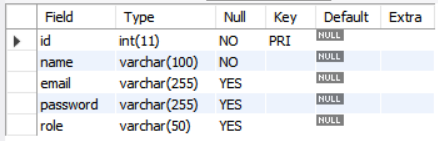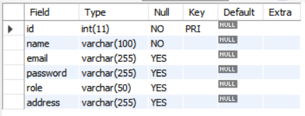 create table author(id int primary key, name varchar(100) NOT NULL , email varchar(255), password varchar(255), role varchar(50), address varchar(255))