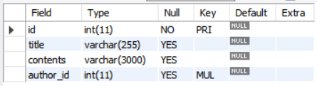 create table post(id int primary key, title varchar(255), contents varchar(3000), author_id int, foreign key(author_id) references author(id))