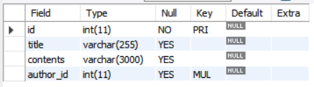 create table post(id int primary key, title varchar(255), contents varchar(3000), author_id int, foreign key(author_id) references author(id))