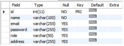 create table author(id int primary key, name varchar(100) NOT NULL , email varchar(255), password varchar(255), role varchar(50), address varchar(255))
