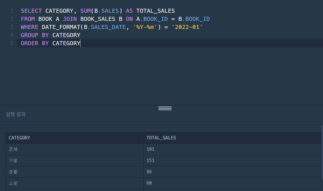 2022년 1월의 카테고리 별 도서 판매량을 합산하고, 카테고리(CATEGORY), 총 판매량(TOTAL_SALES) 리스트를 출력하는 SQL문을 작성해주세요.