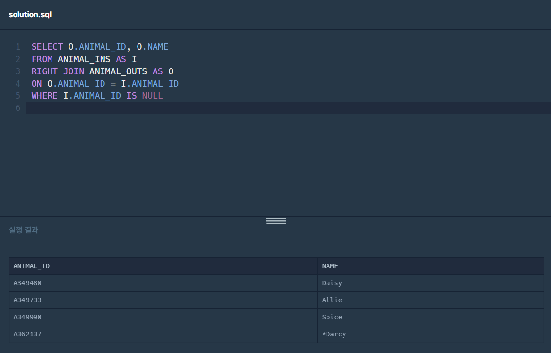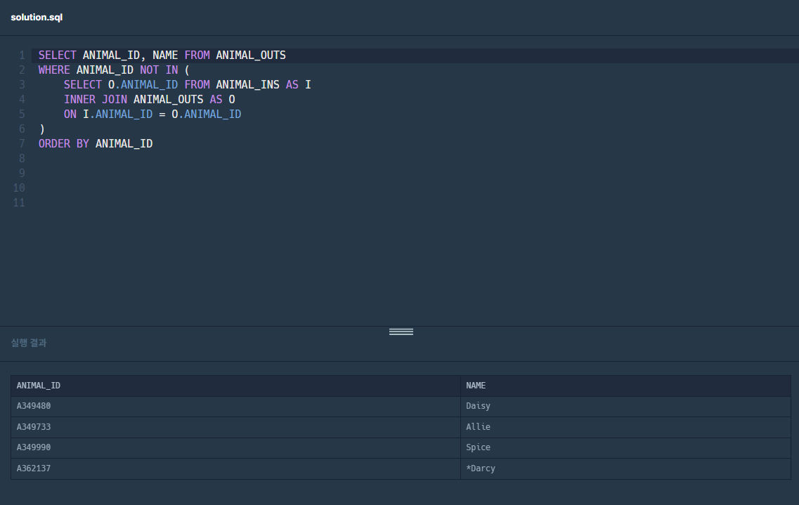 천재지변으로 인해 일부 데이터가 유실되었습니다. 입양을 간 기록은 있는데, 보호소에 들어온 기록이 없는 동물의 ID와 이름을 ID 순으로 조회하는 SQL문을 작성해주세요.