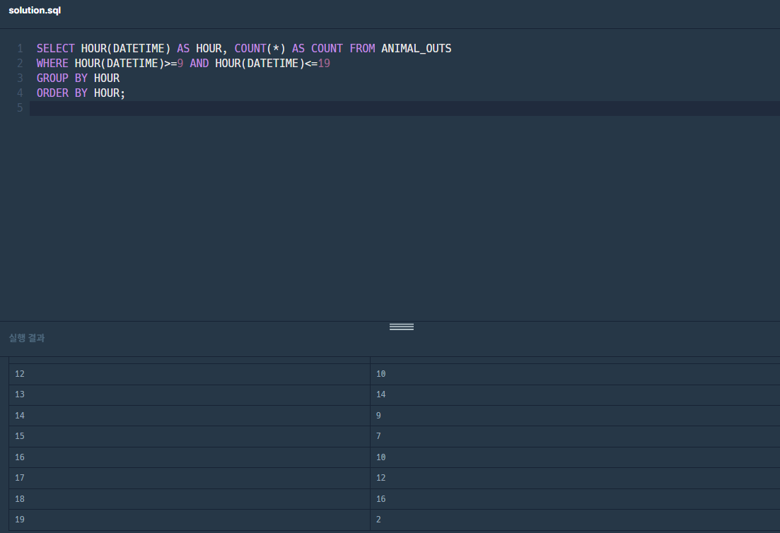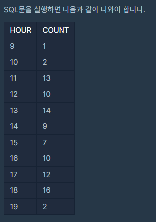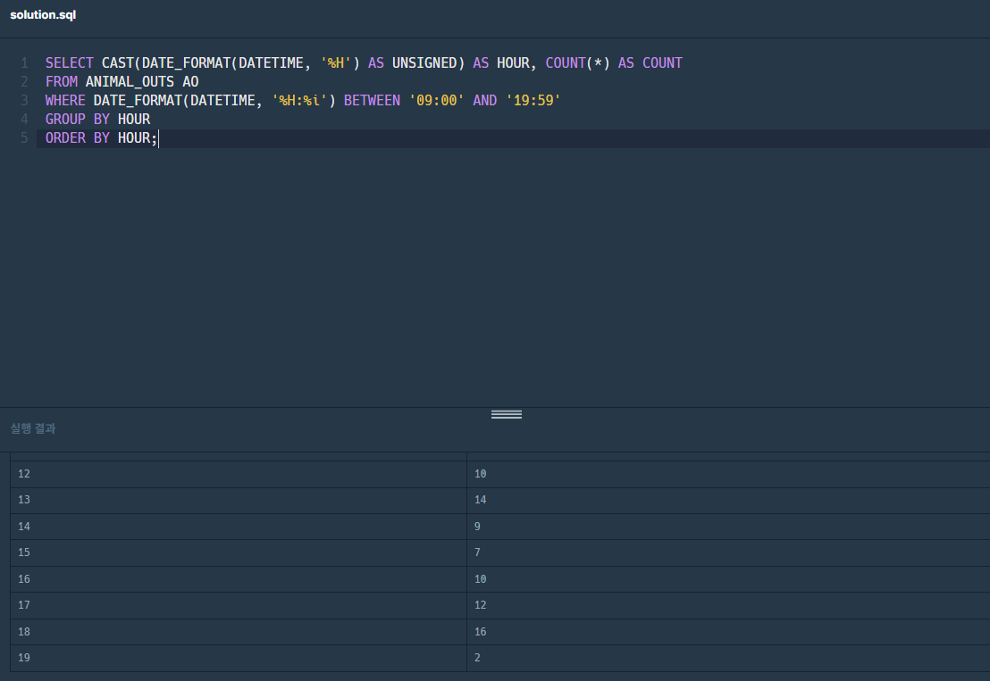 보호소에서는 몇 시에 입양이 가장 활발하게 일어나는지 알아보려 합니다. 09:00부터 19:59까지, 각 시간대별로 입양이 몇 건이나 발생했는지 조회하는 SQL문을 작성해주세요. 이때 결과는 시간대 순으로 정렬해야 합니다.
