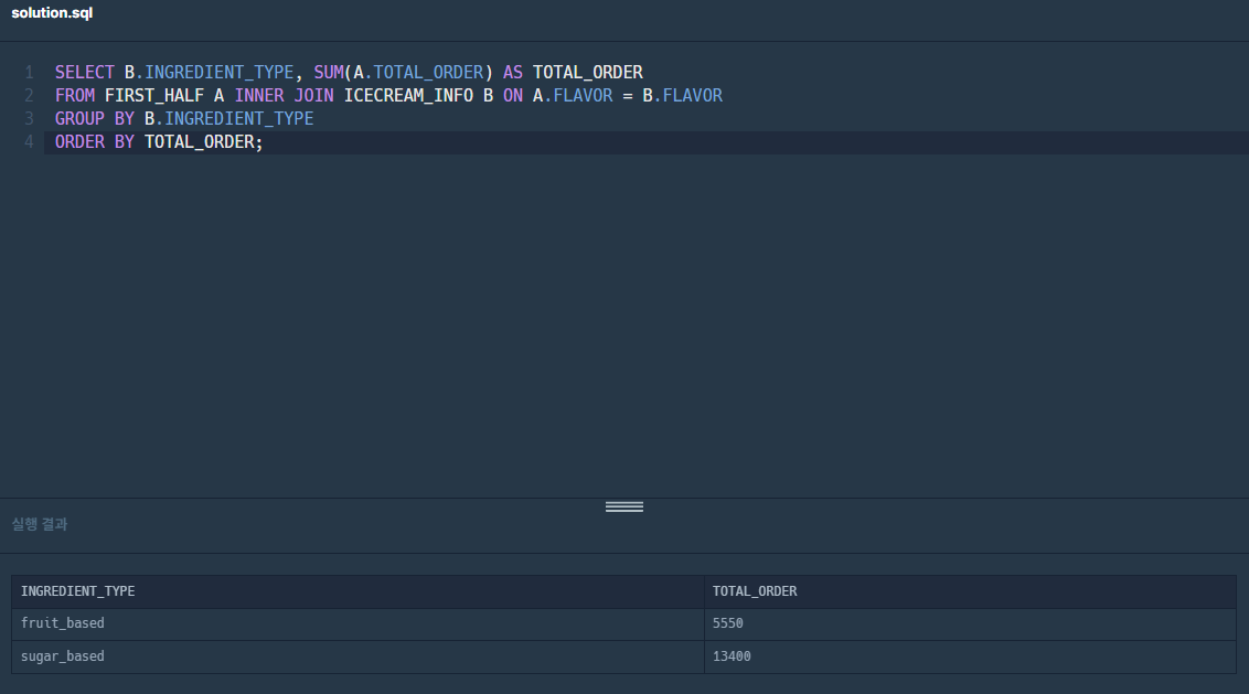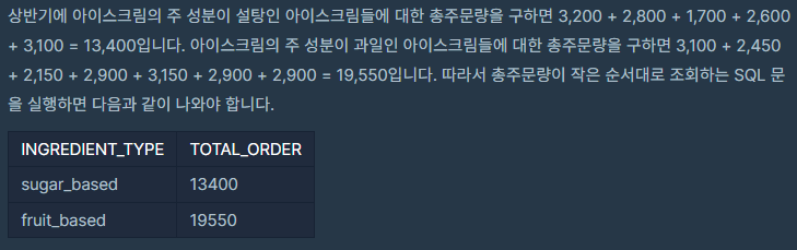 상반기 동안 각 아이스크림 성분 타입과 성분 타입에 대한 아이스크림의 총주문량을 총주문량이 작은 순서대로 조회하는 SQL 문을 작성해주세요. 이때 총주문량을 나타내는 컬럼명은 TOTAL_ORDER로 지정해주세요.