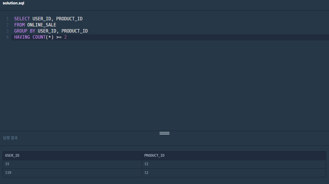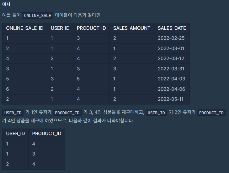 ONLINE_SALE 테이블에서 동일한 회원이 동일한 상품을 재구매한 데이터를 구하여, 재구매한 회원 ID와 재구매한 상품 ID를 출력하는 SQL문을 작성해주세요. 결과는 회원 ID를 기준으로 오름차순 정렬해주시고 회원 ID가 같다면 상품 ID를 기준으로 내림차순 정렬해주세요.