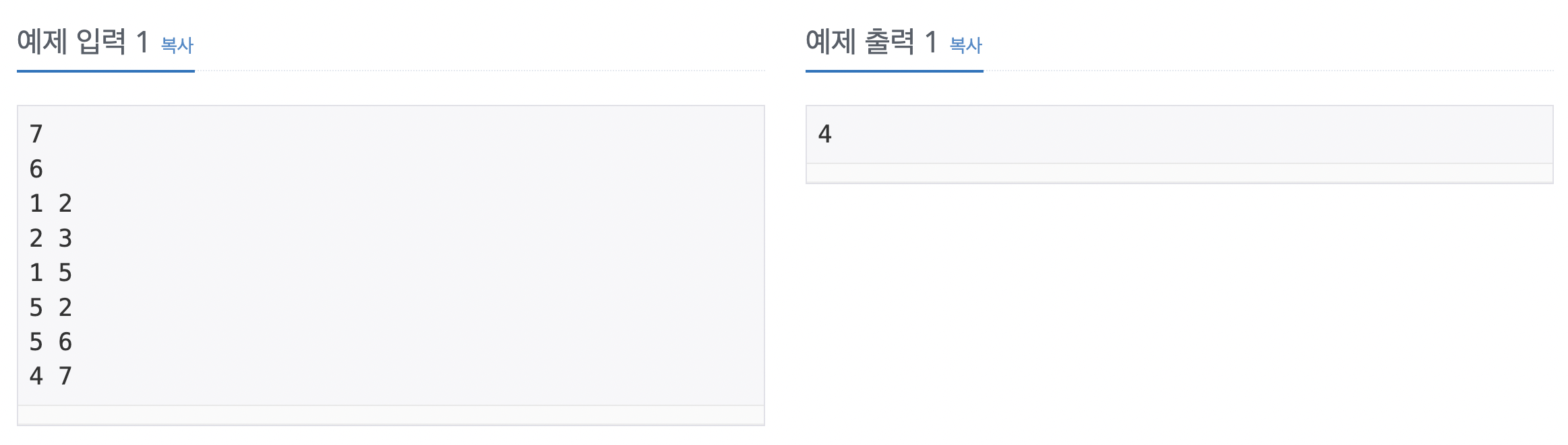 첫째 줄에는 컴퓨터의 수가 주어진다. 컴퓨터의 수는 100 이하인 양의 정수이고 각 컴퓨터에는 1번 부터 차례대로 번호가 매겨진다. 둘째 줄에는 네트워크 상에서 직접 연결되어 있는 컴퓨터 쌍의 수가 주어진다. 이어서 그 수만큼 한 줄에 한 쌍씩 네트워크 상에서 직접 연결되어 있는 컴퓨터의 번호 쌍이 주어진다.