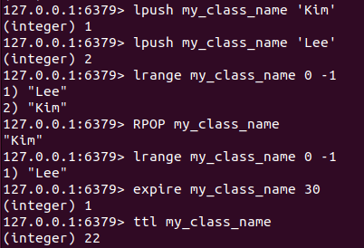 - EXPIRE key명 숫자 (초단위 만료시간)