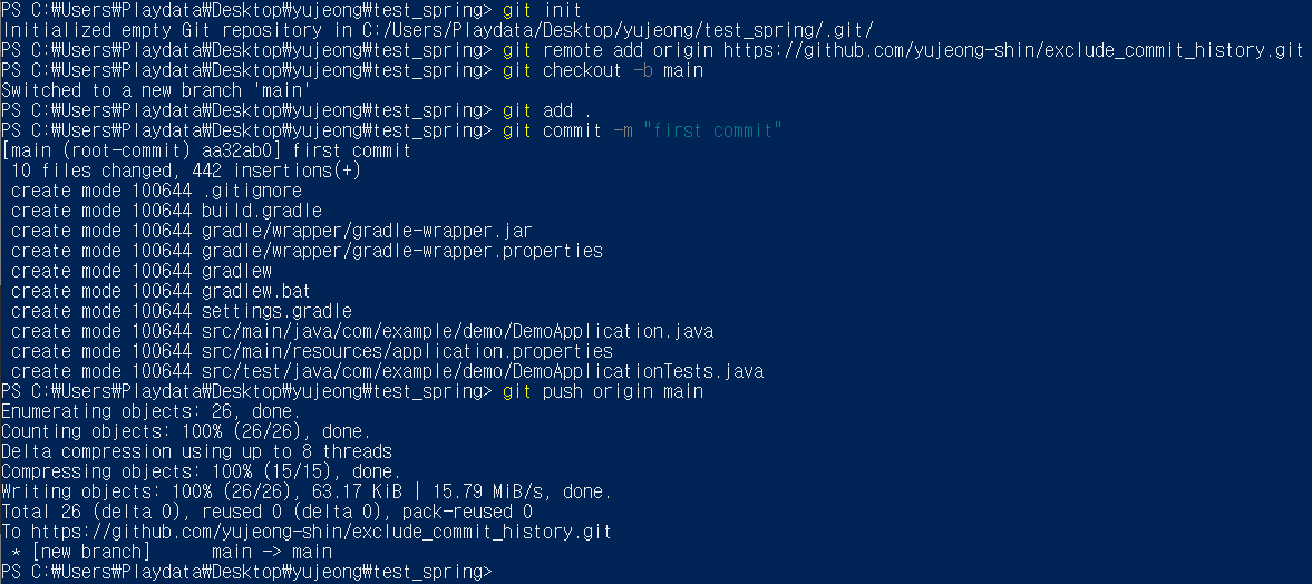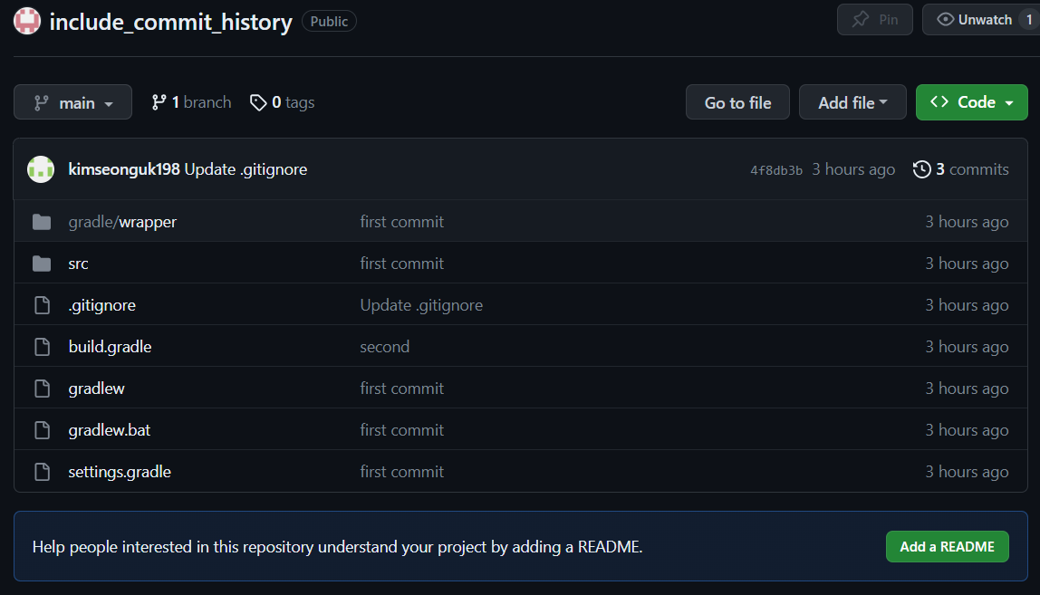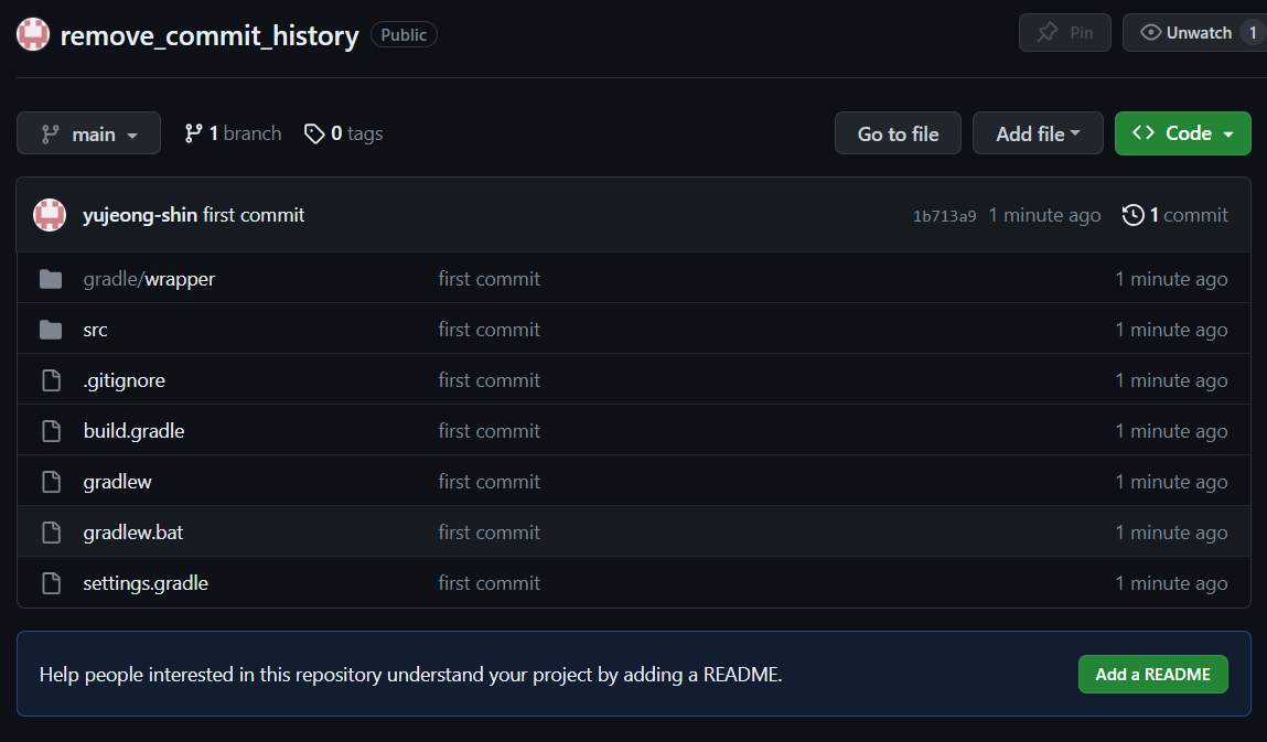 내가 commit한 "first_commit"만 커밋 히스토리에 남음