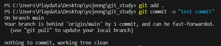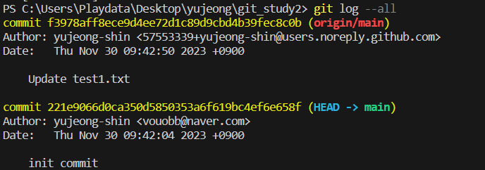 origin/main은 commit이 발생했기 때문에 위에 한 줄이 생기고, 현재 local repo는 하나 아래에 위치하게 된다