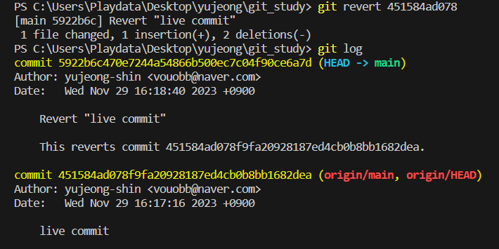 push까지 한 이후 git log확인해서 가장 최근 logID를 사용해 git revert로 되돌리기(this is live code 없애기)
