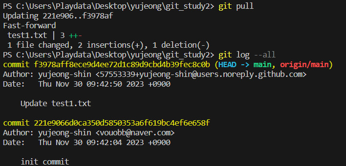 git pull 명령어를 통해 원격 저장소의 변경 사항을 로컬 저장소에도 반영한다.