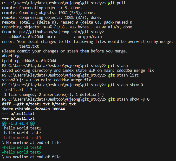 git stash (로컬 저장소에서 원격 저장소와 다른 부분이 삭제되며 수정사항 별도 파일 저장)