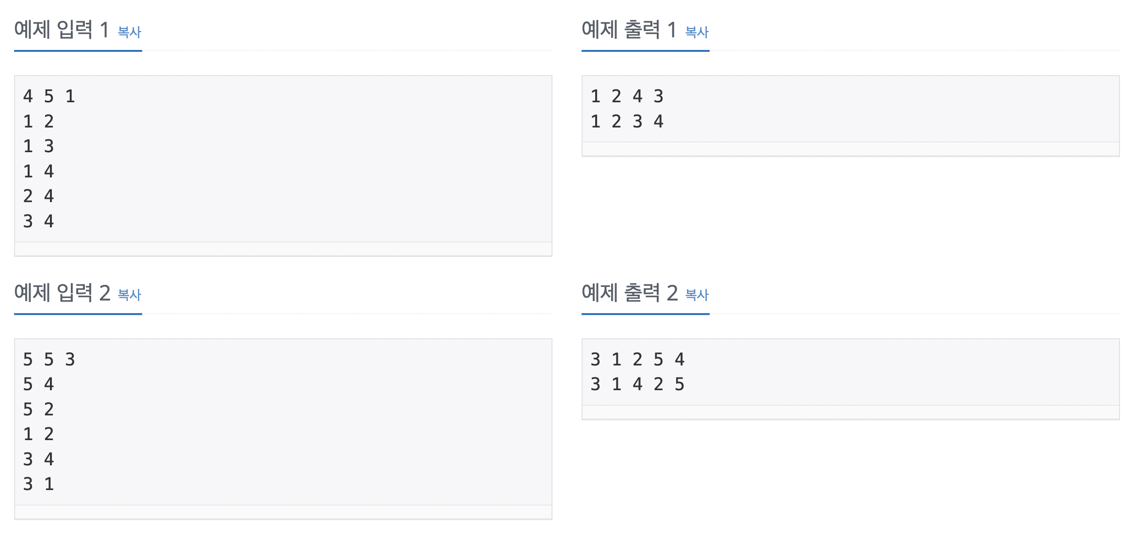 그래프를 DFS로 탐색한 결과와 BFS로 탐색한 결과를 출력하는 프로그램을 작성하시오. 단, 방문할 수 있는 정점이 여러 개인 경우에는 정점 번호가 작은 것을 먼저 방문하고, 더 이상 방문할 수 있는 점이 없는 경우 종료한다. 정점 번호는 1번부터 N번까지이다.