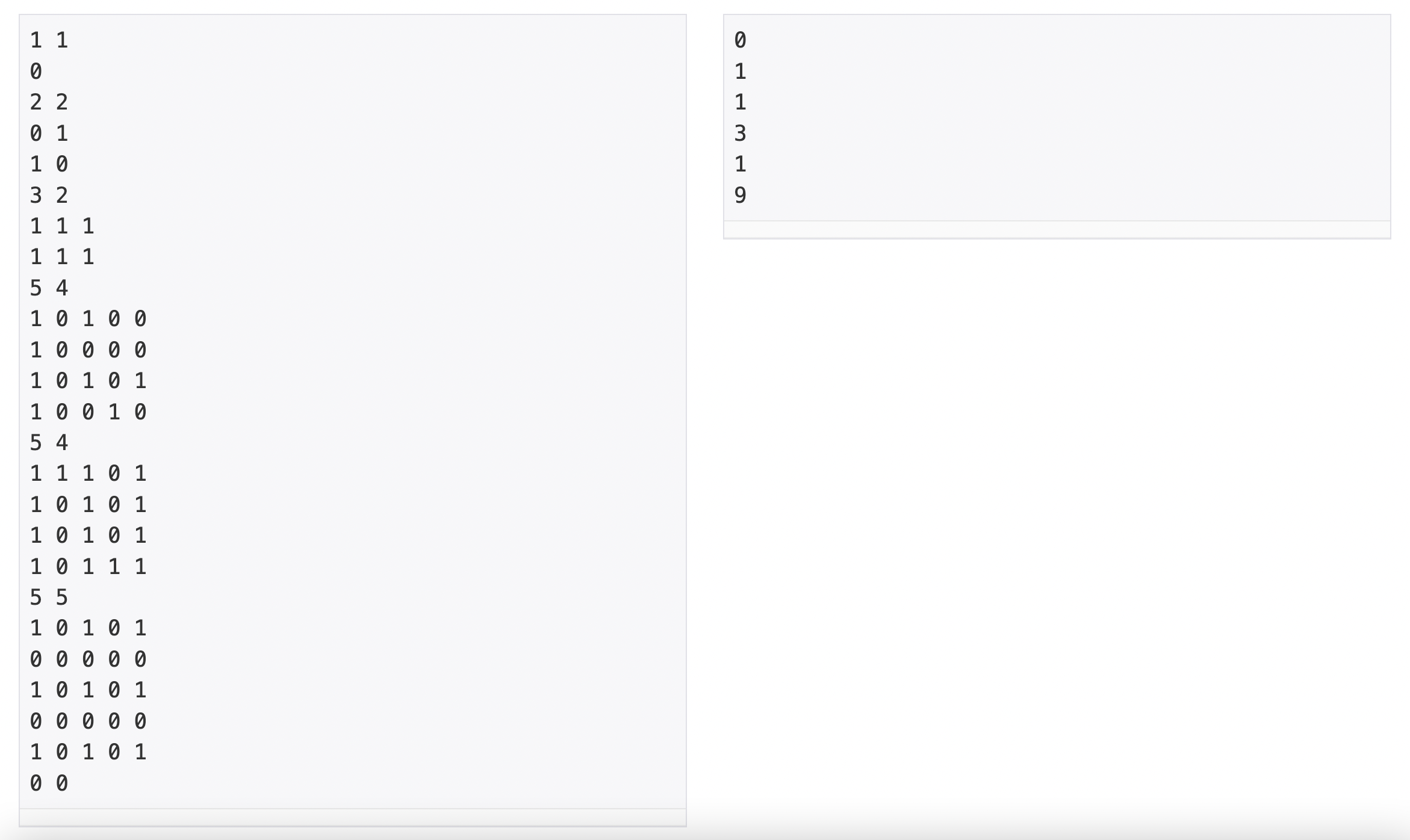 입력은 여러 개의 테스트 케이스로 이루어져 있다. 각 테스트 케이스의 첫째 줄에는 지도의 너비 w와 높이 h가 주어진다. w와 h는 50보다 작거나 같은 양의 정수이다.