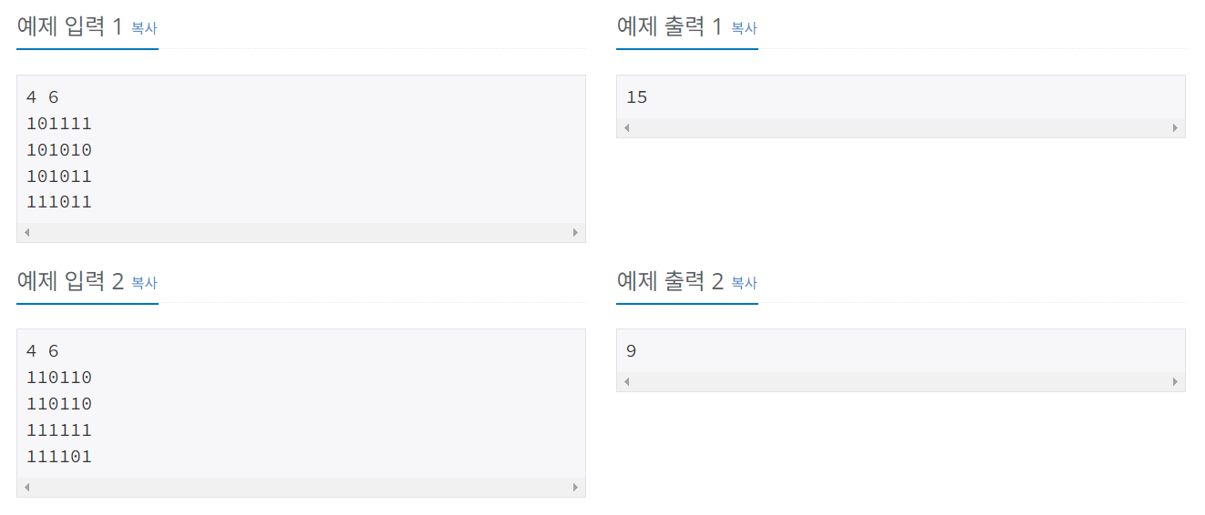첫째 줄에 두 정수 N, M(2 ≤ N, M ≤ 100)이 주어진다. 다음 N개의 줄에는 M개의 정수로 미로가 주어진다. 각각의 수들은 붙어서 입력으로 주어진다.