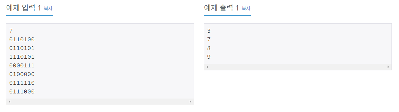<그림 1>과 같이 정사각형 모양의 지도가 있다. 1은 집이 있는 곳을, 0은 집이 없는 곳을 나타낸다. 철수는 이 지도를 가지고 연결된 집의 모임인 단지를 정의하고, 단지에 번호를 붙이려 한다. 여기서 연결되었다는 것은 어떤 집이 좌우, 혹은 아래위로 다른 집이 있는 경우를 말한다. 대각선상에 집이 있는 경우는 연결된 것이 아니다. <그림 2>는 <그림 1>을 단지별로 번호를 붙인 것이다. 지도를 입력하여 단지수를 출력하고, 각 단지에 속하는 집의 수를 오름차순으로 정렬하여 출력하는 프로그램을 작성하시오.