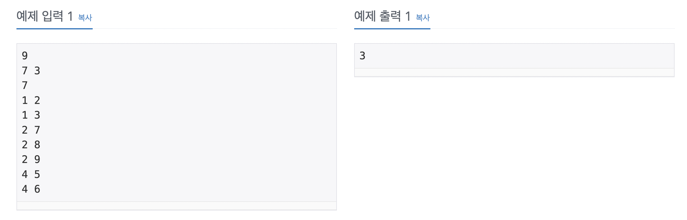사람들은 1, 2, 3, …, n (1 ≤ n ≤ 100)의 연속된 번호로 각각 표시된다. 입력 파일의 첫째 줄에는 전체 사람의 수 n이 주어지고, 둘째 줄에는 촌수를 계산해야 하는 서로 다른 두 사람의 번호가 주어진다. 그리고 셋째 줄에는 부모 자식들 간의 관계의 개수 m이 주어진다. 넷째 줄부터는 부모 자식간의 관계를 나타내는 두 번호 x,y가 각 줄에 나온다. 이때 앞에 나오는 번호 x는 뒤에 나오는 정수 y의 부모 번호를 나타낸다.
