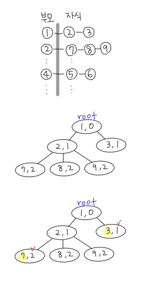// 부모-자식 한 번만 연결해서 풀 수는 없을까?