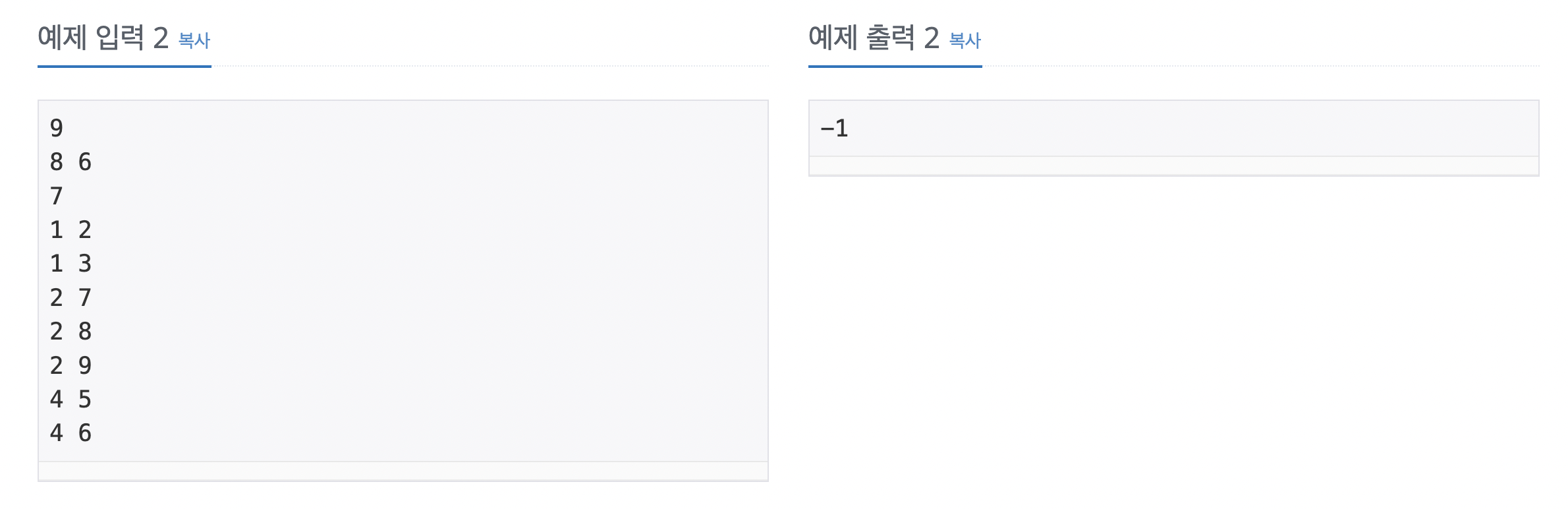 입력에서 요구한 두 사람의 촌수를 나타내는 정수를 출력한다. 어떤 경우에는 두 사람의 친척 관계가 전혀 없어 촌수를 계산할 수 없을 때가 있다. 이때에는 -1을 출력해야 한다.