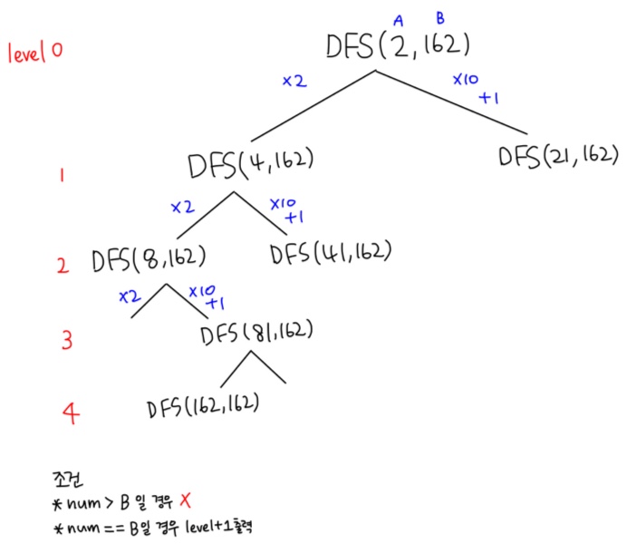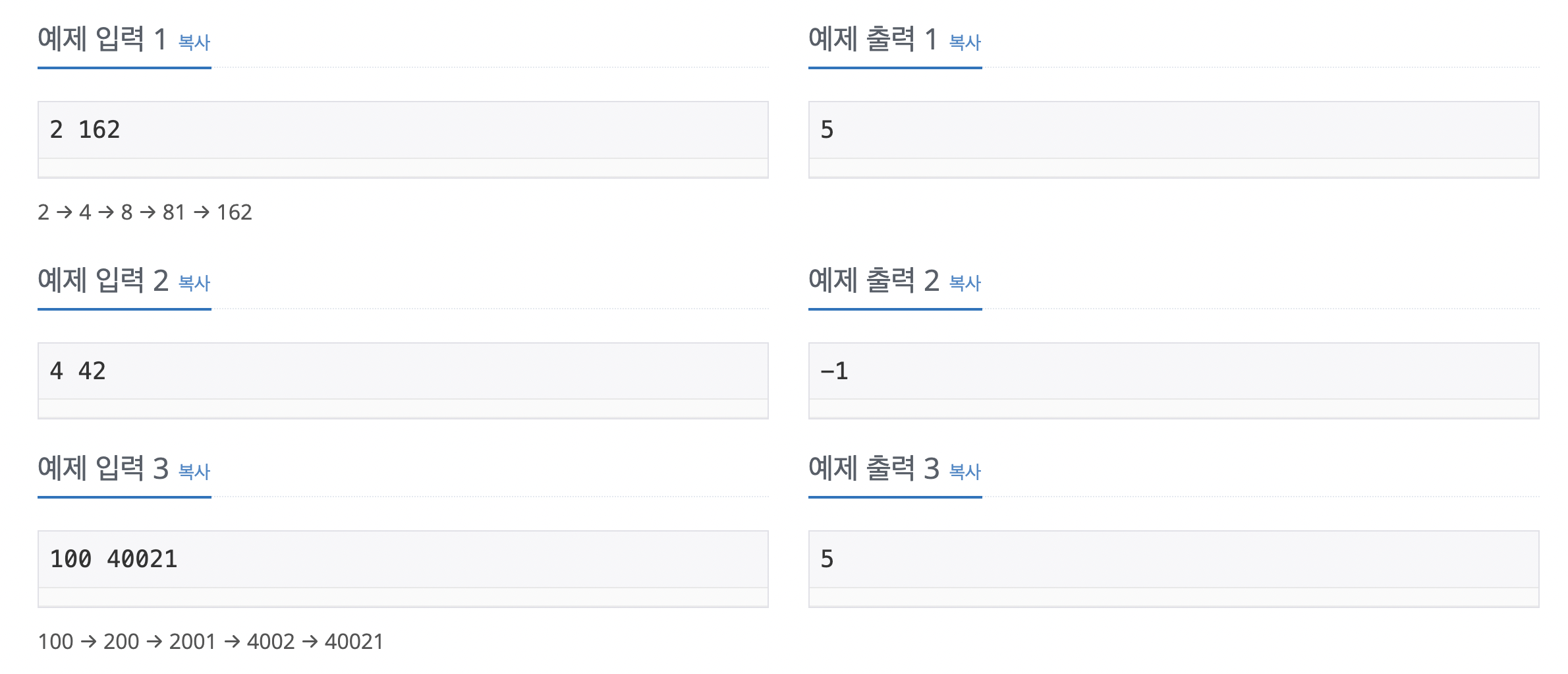 문제 정수 A를 B로 바꾸려고 한다. 가능한 연산은 다음과 같은 두 가지이다. - 2를 곱한다. - 1을 수의 가장 오른쪽에 추가한다. A를 B로 바꾸는데 필요한 연산의 최솟값을 구해보자 2 162 풀이 - A가 B