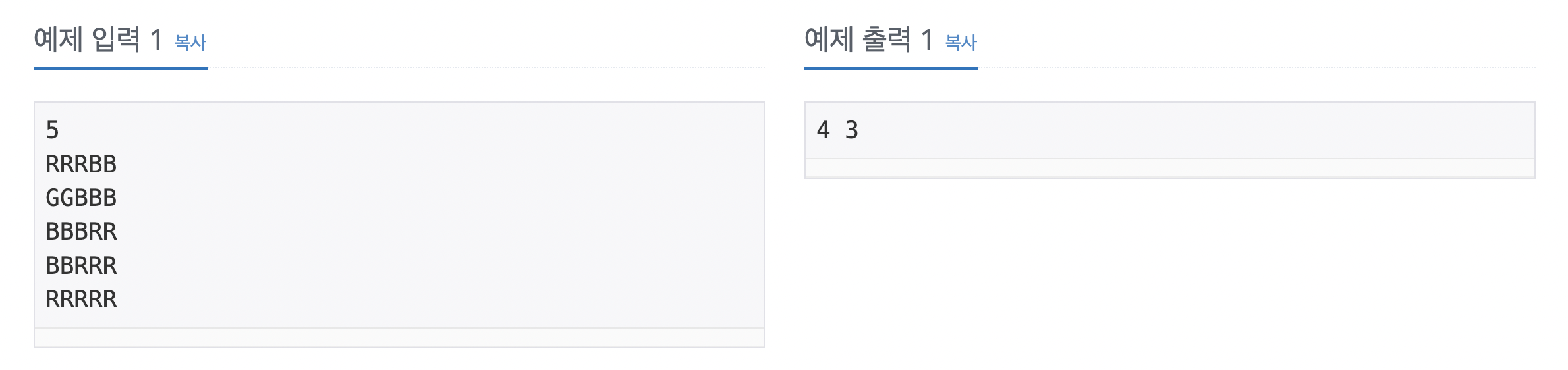 그림이 입력으로 주어졌을 때, 적록색약인 사람이 봤을 때와 아닌 사람이 봤을 때 구역의 수를 구하는 프로그램을 작성하시오.