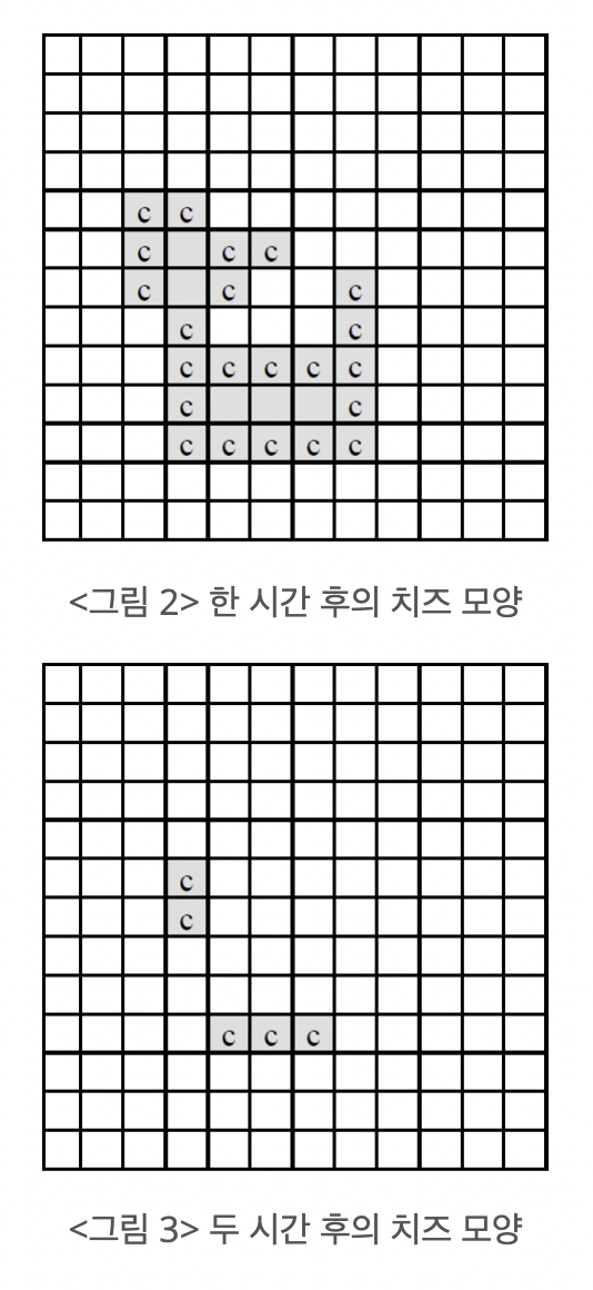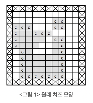 아래 <그림 1>과 같이 정사각형 칸들로 이루어진 사각형 모양의 판이 있고, 그 위에 얇은 치즈(회색으로 표시된 부분)가 놓여 있다. 판의 가장자리(<그림 1>에서 네모 칸에 X친 부분)에는 치즈가 놓여 있지 않으며 치즈에는 하나 이상의 구멍이 있을 수 있다.