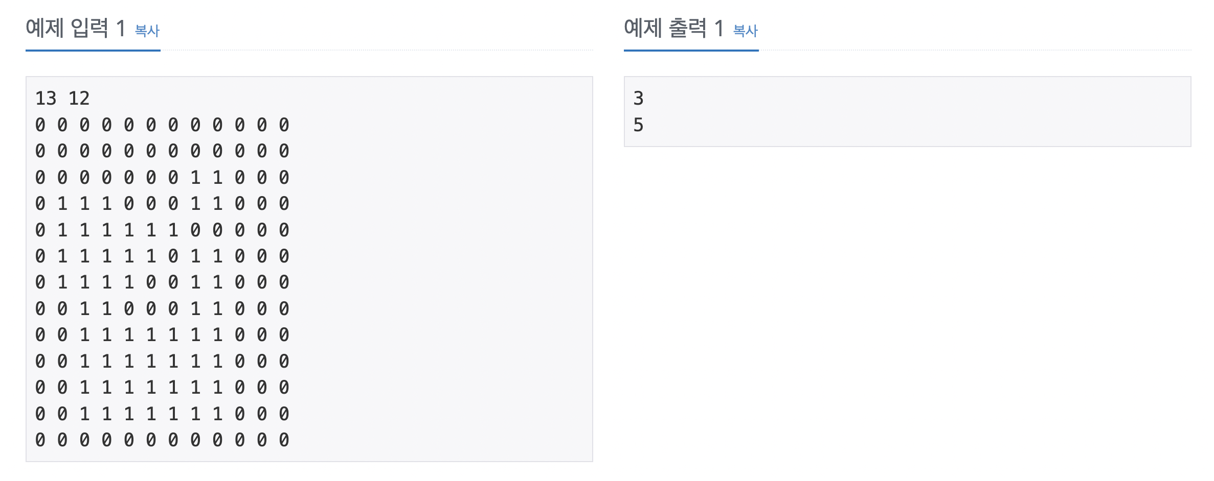 첫째 줄에는 사각형 모양 판의 세로와 가로의 길이가 양의 정수로 주어진다. 세로와 가로의 길이는 최대 100이다. 판의 각 가로줄의 모양이 윗 줄부터 차례로 둘째 줄부터 마지막 줄까지 주어진다. 치즈가 없는 칸은 0, 치즈가 있는 칸은 1로 주어지며 각 숫자 사이에는 빈칸이 하나씩 있다.