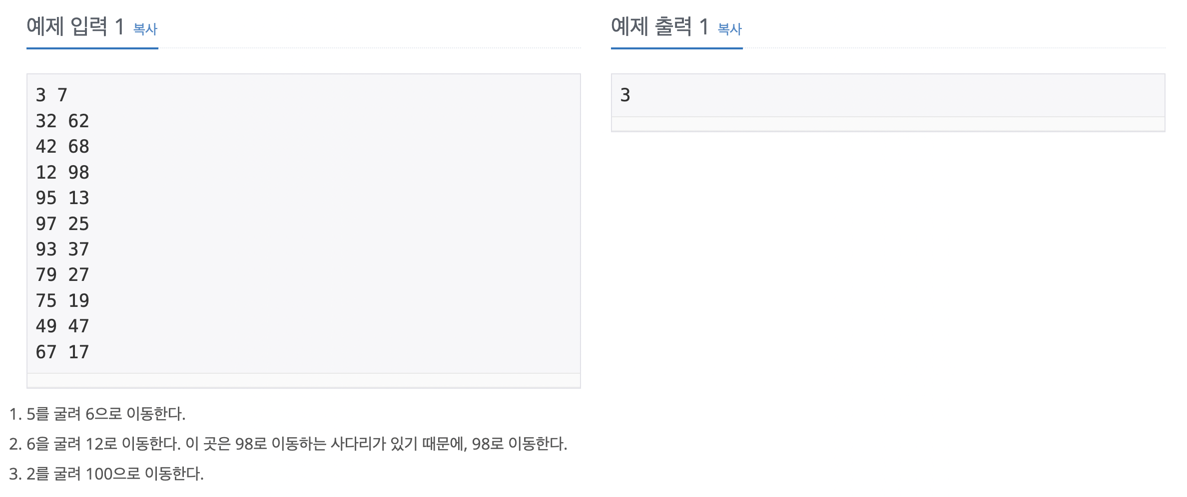 예제 입력 1번의 경우 아래 그림처럼 100번 칸에 도착하기 위해 주사위를 굴려야 하는 횟수의 최솟값을은 3이 된다.