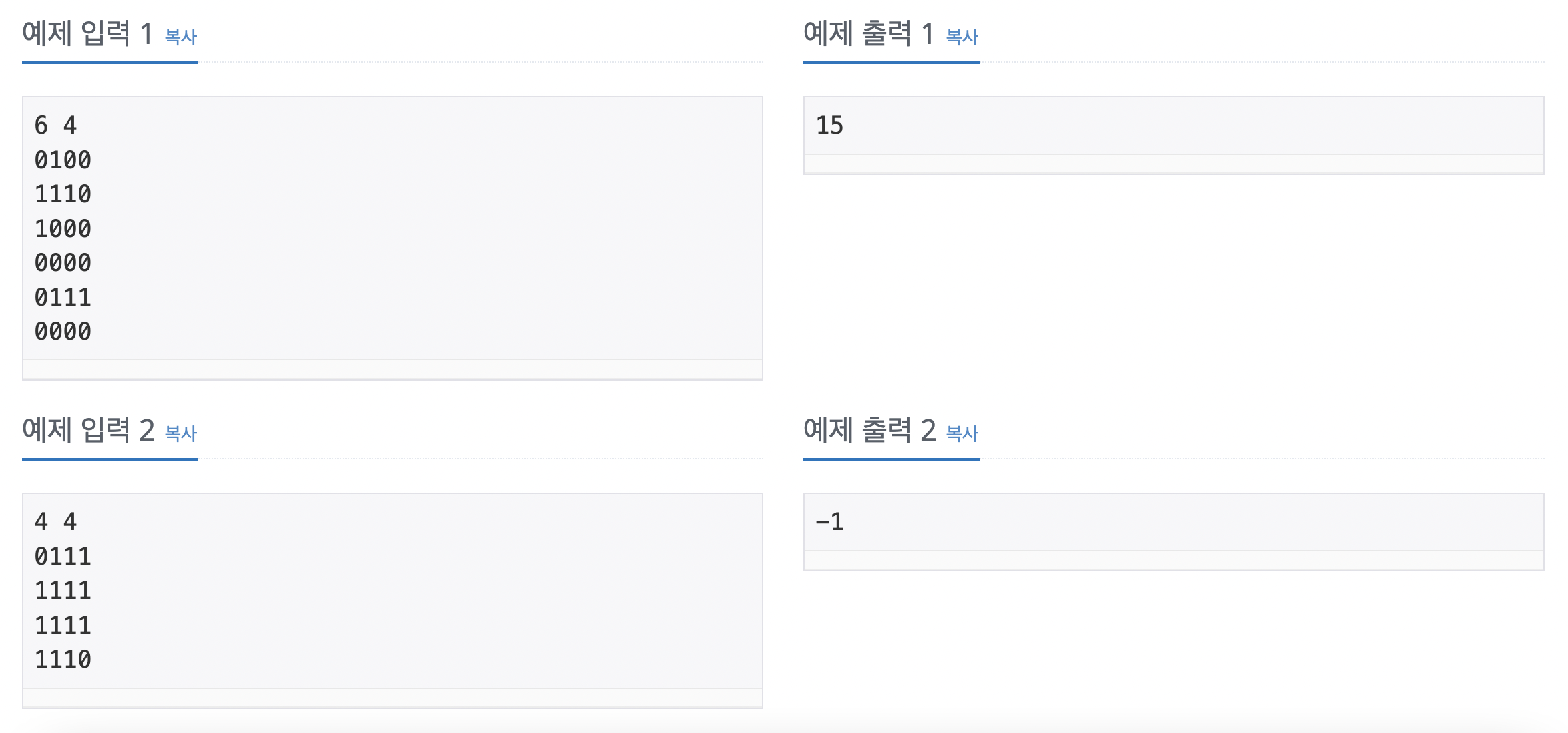 첫째 줄에 N(1 ≤ N ≤ 1,000), M(1 ≤ M ≤ 1,000)이 주어진다. 다음 N개의 줄에 M개의 숫자로 맵이 주어진다. (1, 1)과 (N, M)은 항상 0이라고 가정하자.