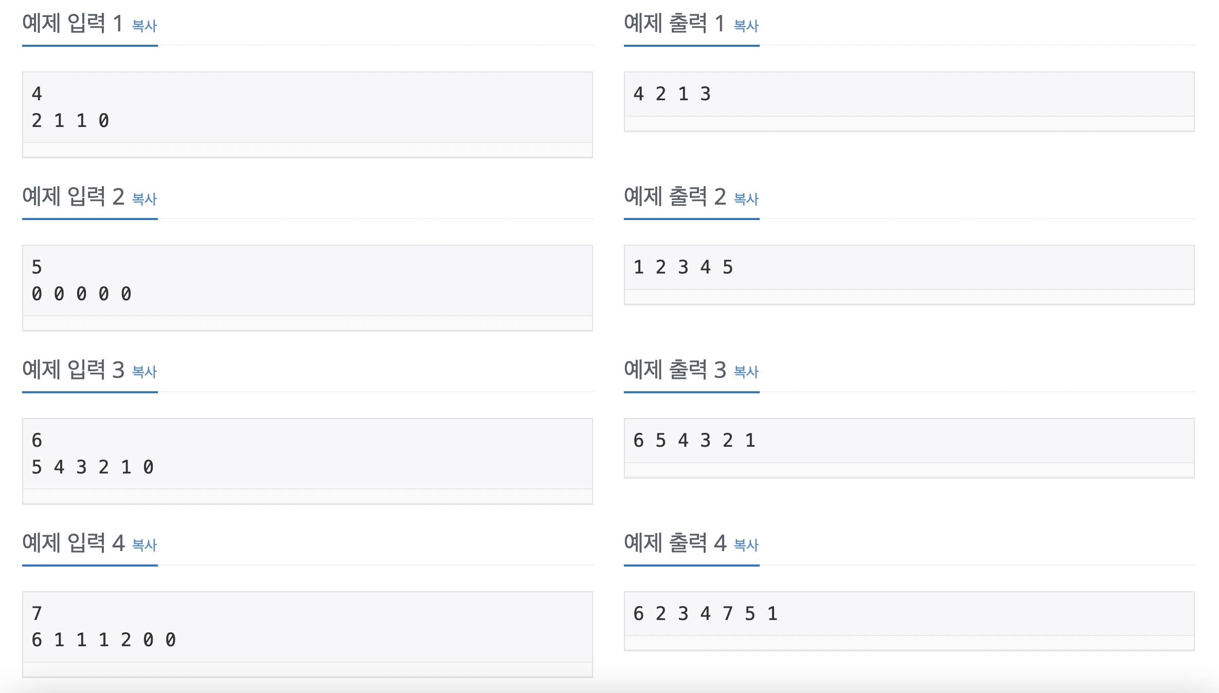 첫째 줄에 사람의 수 N이 주어진다. N은 10보다 작거나 같은 자연수이다. 둘째 줄에는 키가 1인 사람부터 차례대로 자기보다 키가 큰 사람이 왼쪽에 몇 명이 있었는지 주어진다. i번째 수는 0보다 크거나 같고, N-i보다 작거나 같다. i는 0부터 시작한다.