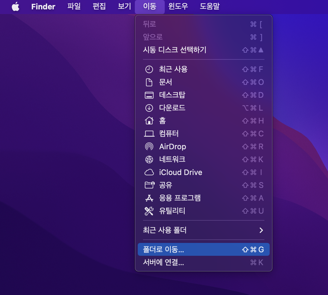 상단에 마우스를 올려 상단 메뉴바를 꺼낸 후 Finder > 폴더로 이동... 을 클릭합니다.