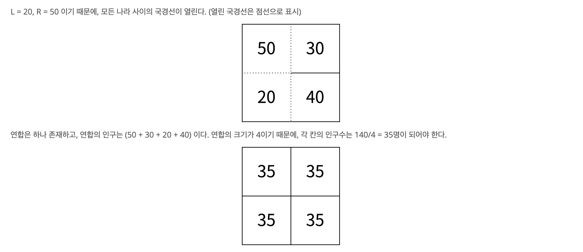 - 연합을 이루고 있는 각 칸의 인구수는 (연합의 인구수) / (연합을 이루고 있는 칸의 개수)가 된다. 편의상 소수점은 버린다.