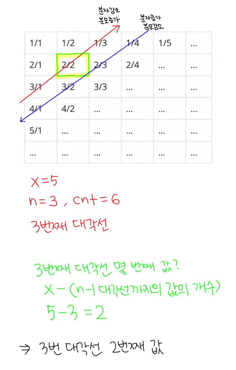 X에서 이전 대각선까지의 총 값의 개수를 빼주면 현재 대각선에서 몇 번째 위치의 값인지 알 수 있다