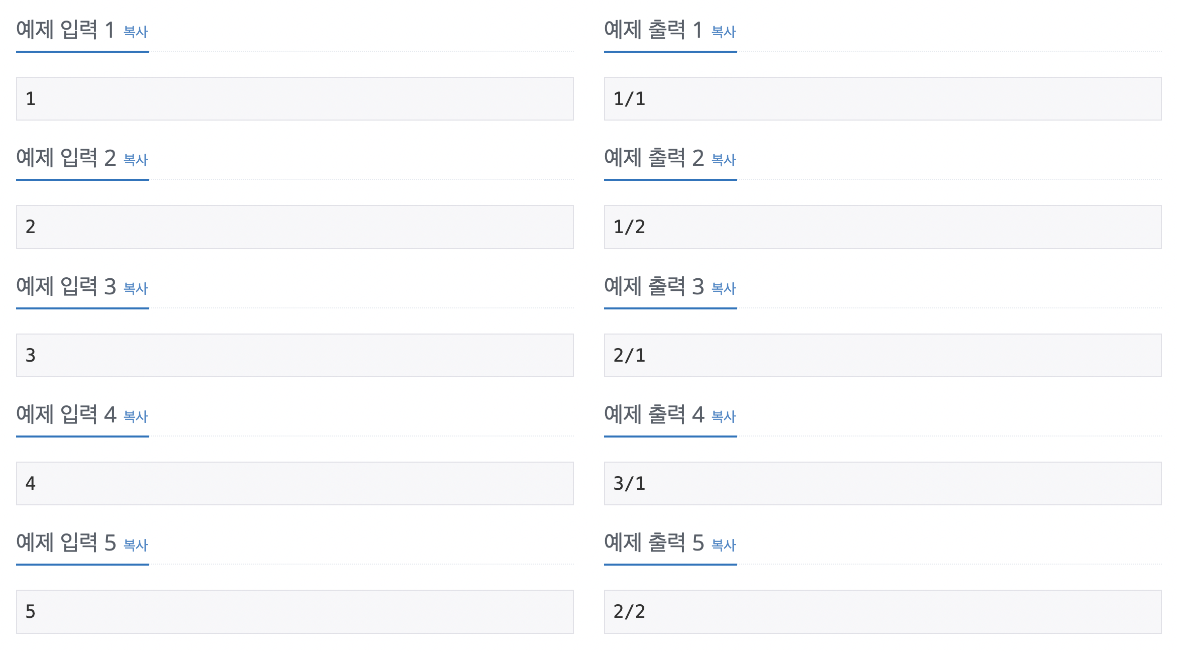bunja=1; bunmo=n; //1번째 칸에서 세기 시작