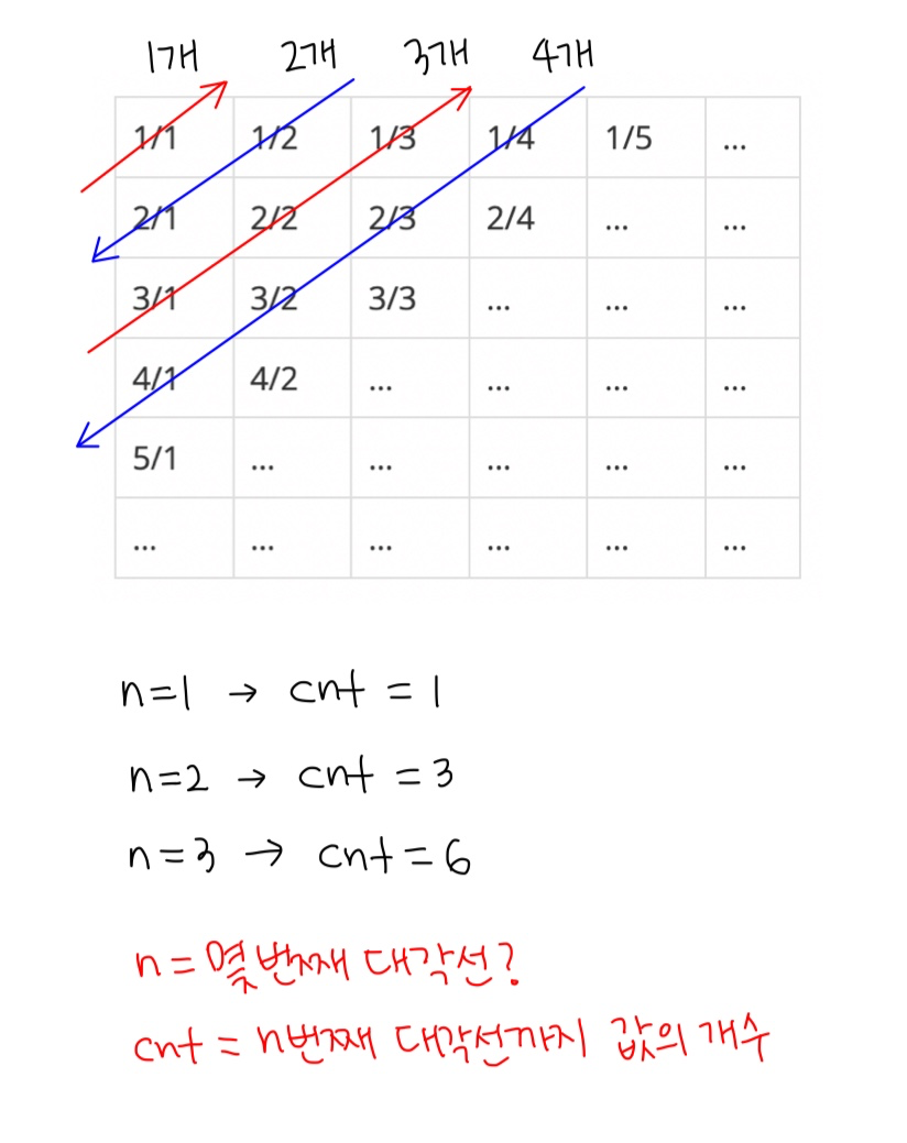 int num = X-(n-1)*n/2; //대각선에서 몇 번째 위치인지 찾는 코드