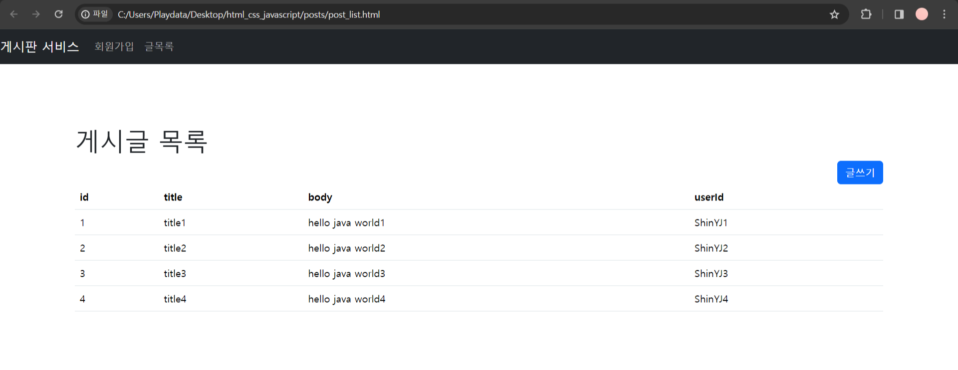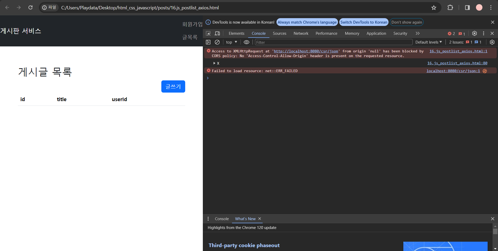 (1) CORS 오류 해결방법 1번으로 CORS 오류를 잡아주고 C:/Users/Playdata/Desktop/html_css_javascript/posts/post_list.html 폴더에 있는 HTML 파일을 연다. (HTML 코드는 2번 방식과 동일하다)