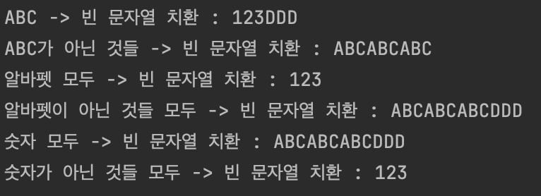 System.out.println("ABC가 아닌 것들 -> 빈 문자열 치환 : "+ result);