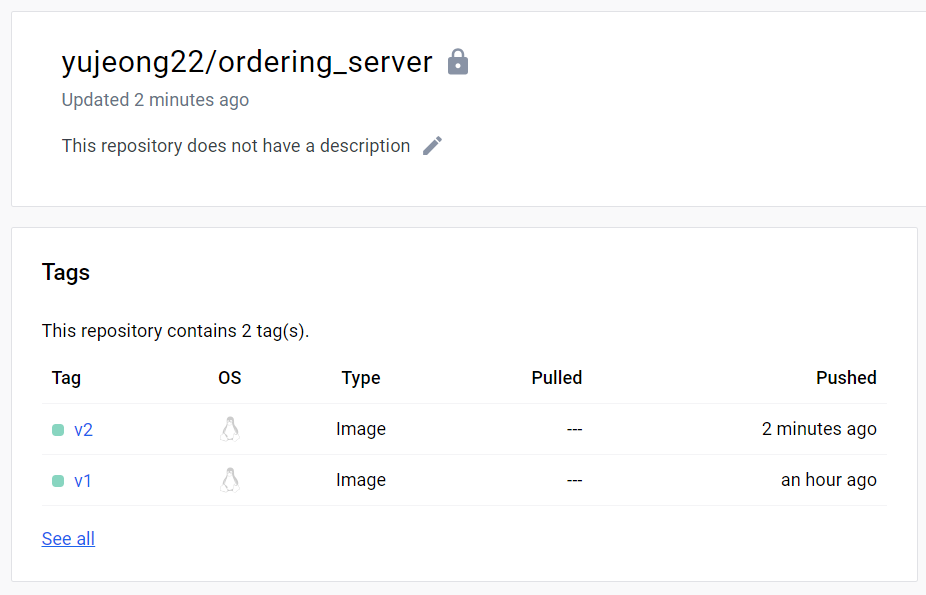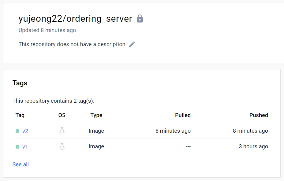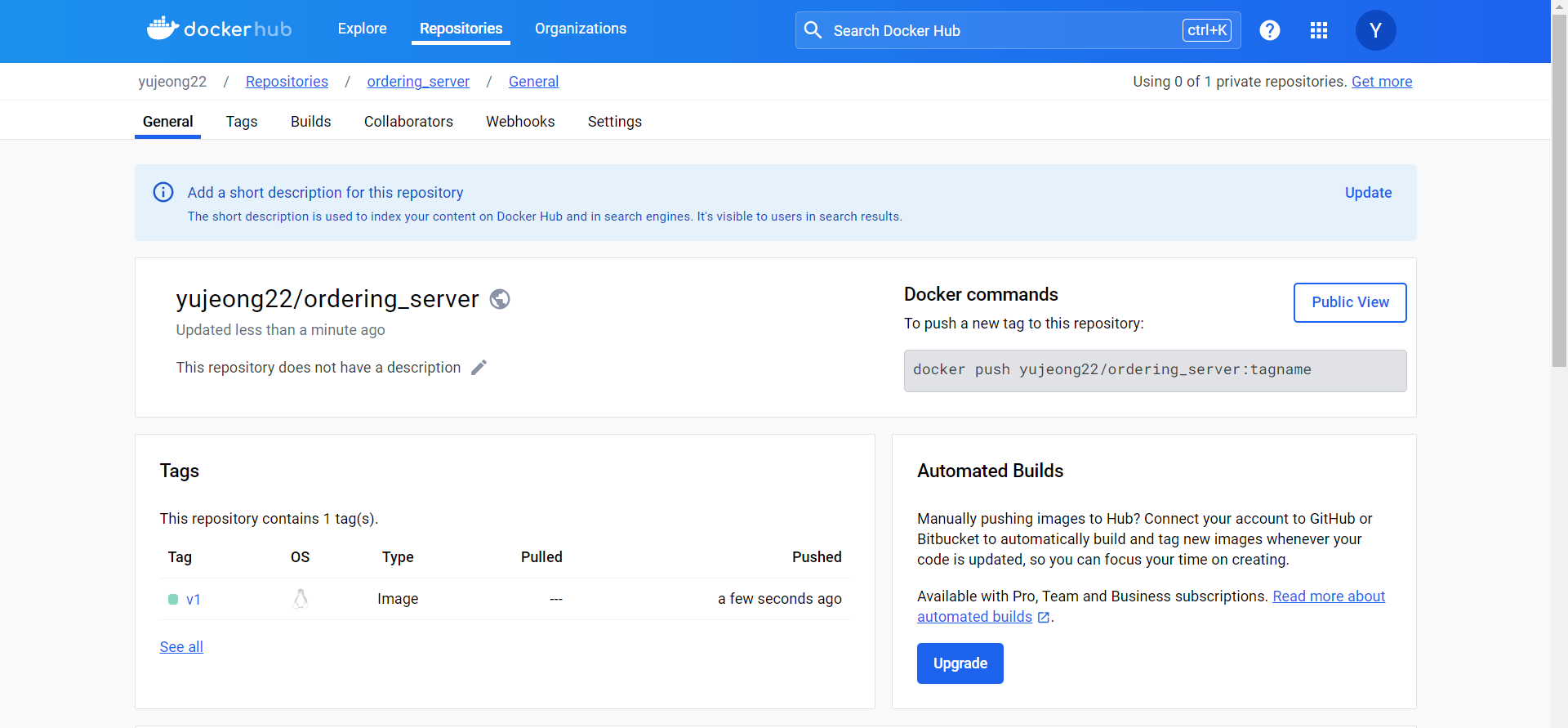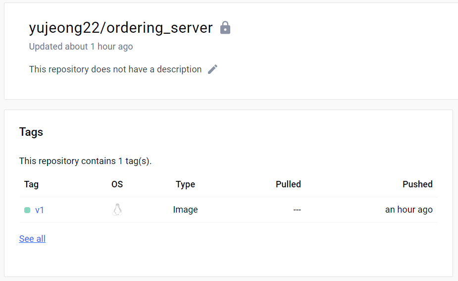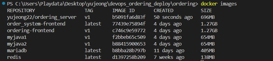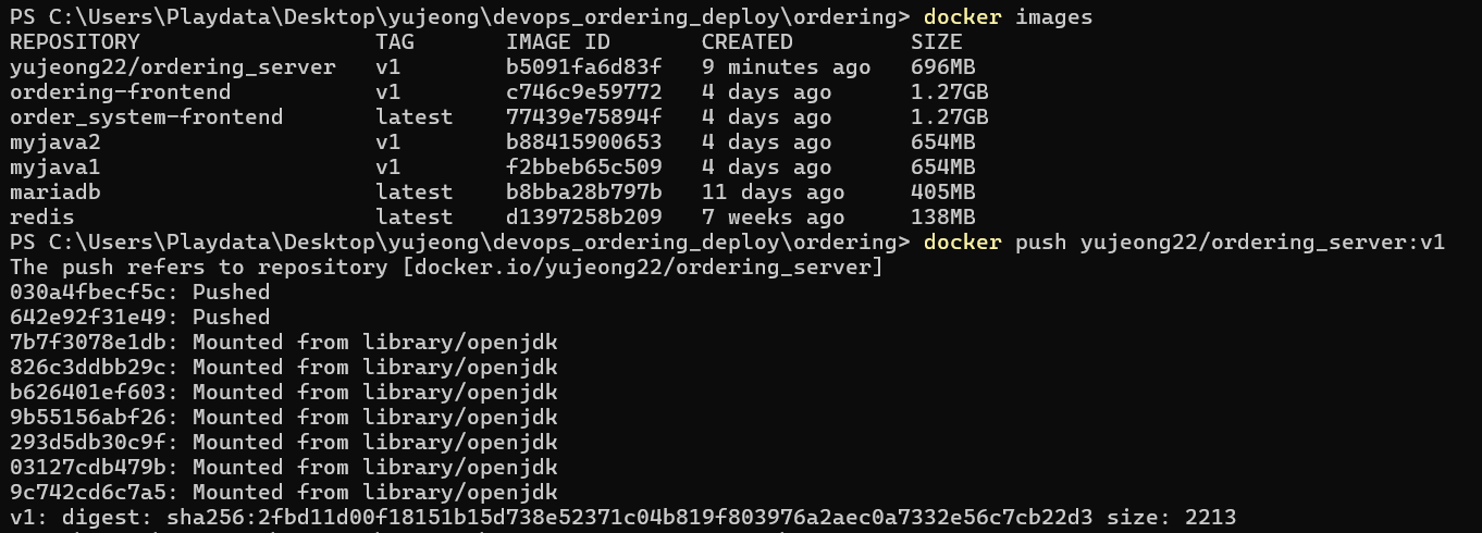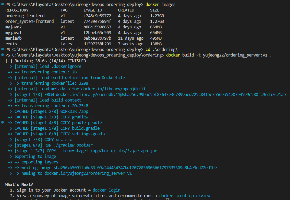1. docker build -t 옵션을 통해 order_system 이미지 생성 : 개인 차원에서 docker hub에 private/public 이미지 업로드 가능