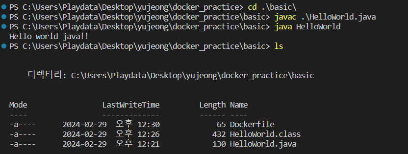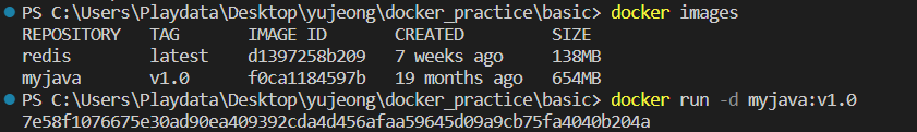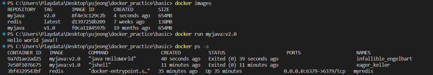 Dockerfile이 있는 곳으로 이동 -> docker build -t myjava:v1.0 . 실행 -> docker images로 java파일 확인 후 실행