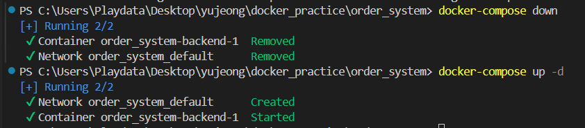 (+) docker-compse up => 테스트해보니 문제 => docker-compose down => 수정 => 이미 이미지가 남아있어서 docker-compose up해도 있는 이미지 실행 => docker-compose build를 통해 이미지 업데이트 => docker-compose up