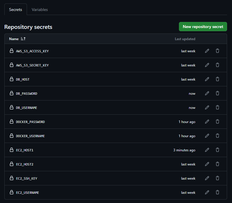 git secrets에 DOCKER_USERNAME, DOCKER_PASSWORD 등록