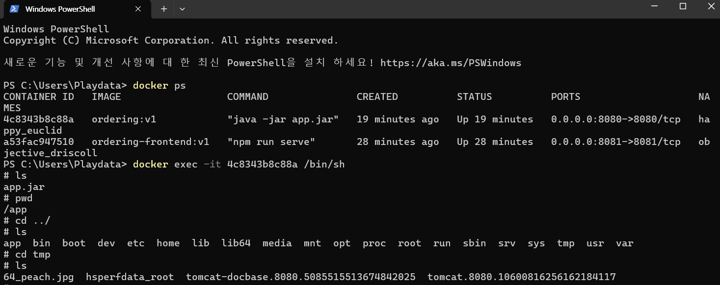 방금 만든 이미지(컨테이너)가 가동 중인지 확인.