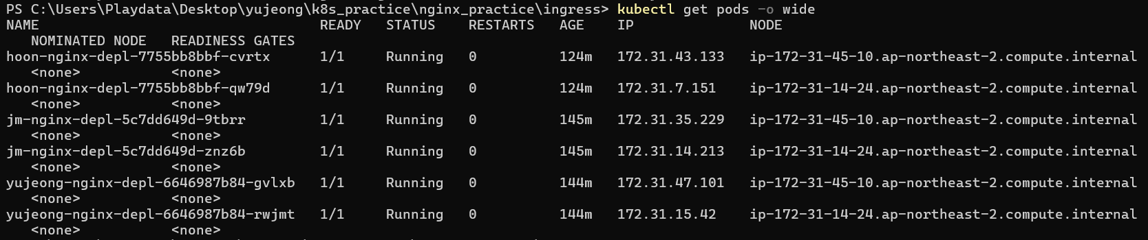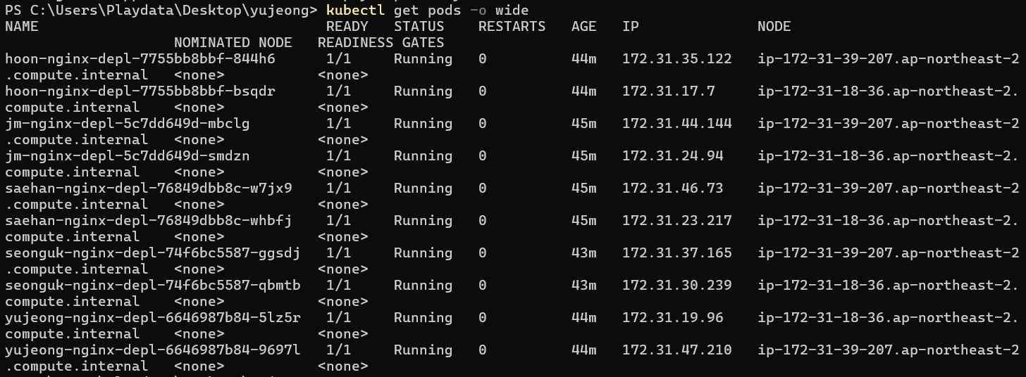 kubectl get pods -o wid 명령어를 통해 생성한 pods들의 IP와 NODE 정보를 확인할 수 있다.