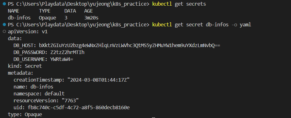 설정해준 [db-infos]이름으로 get secret -o yaml 명령어를 통해 인코딩된 내용을 확인할 수 있다.