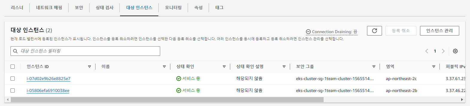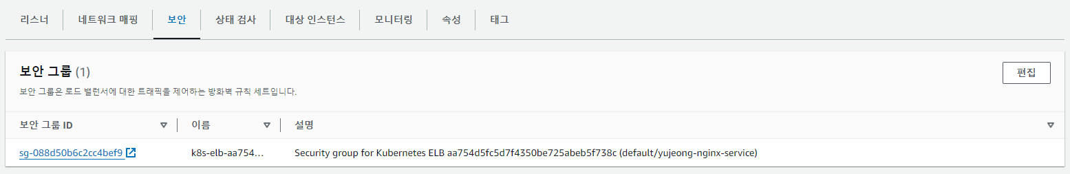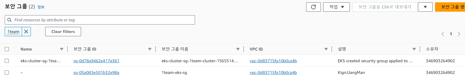 내가 만든 보안 그룹(아래)와 eks가 방금 만들어준 보안 그룹(위)을 볼 수 있다.